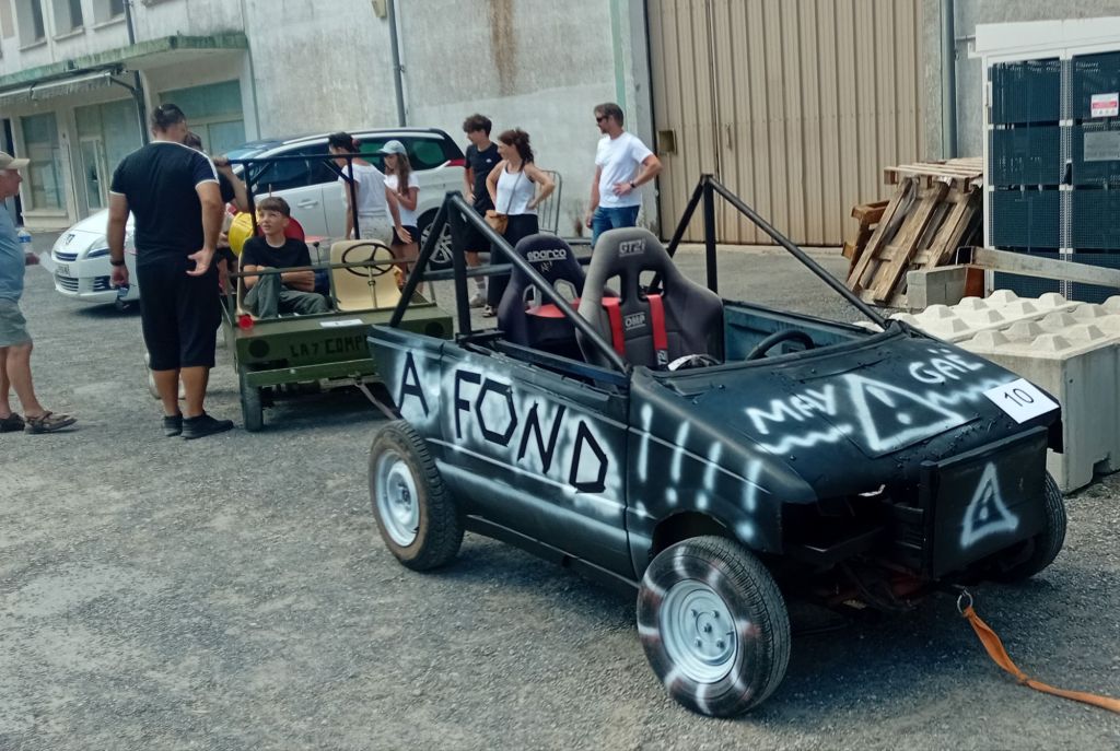 Des concurrents de 15 à 65 ans participaient à la course. Au volant d’une caisse à savon kaki baptisée » la 7eme compagnie », j’ai rencontré deux jeunes de Villefranche de Panat : Tristan et Teddy. « Nous avons travaillé à temps perdu 2 /3 mois sur notre engin. Nous avions déjà participé à cette course, l’an dernier. Nous en faisons d’autres. La prochaine sera à Padiés près de Requista ». Les deux jeunes pilotes en conviennent des ajustements sont à prévoir. « On a quelques petits soucis, on glisse, il va falloir que nous rajoutions du poids ».