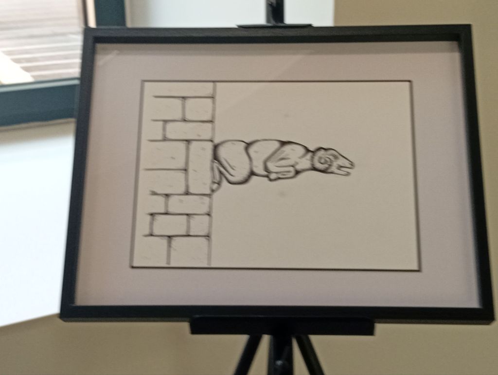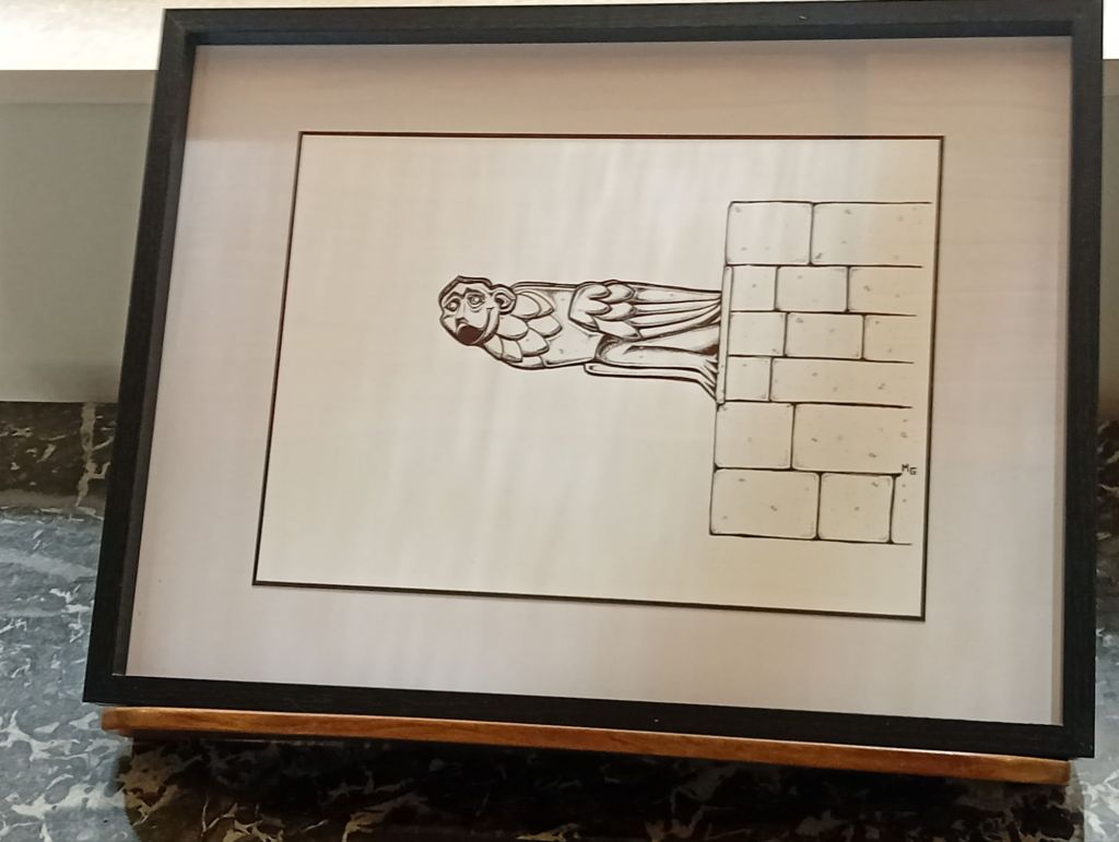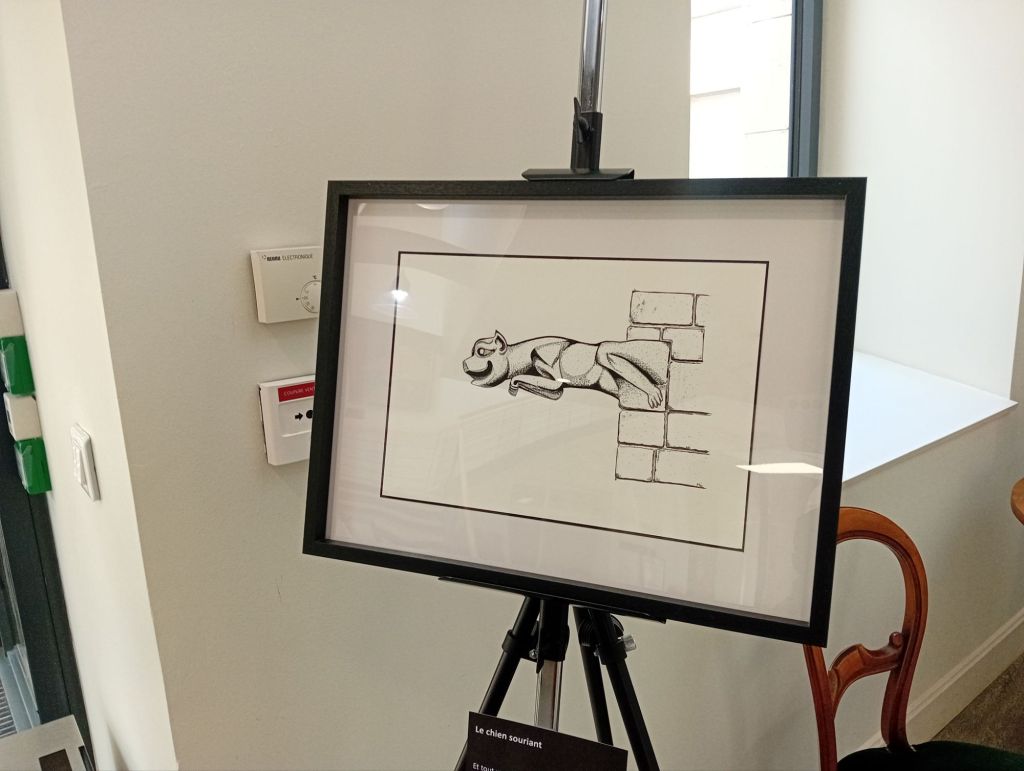 Jackie a effectué, en vain, des recherches sur les gargouilles ruthénoises . « Il y a des recherches statutaires, mais rien sur les gargouilles , même les plus fins connaisseurs du secteur n’en ont pas! ». Finalement je dirais : c’est tant mieux ! Car, Jackie, l’amoureux des mots, a pu ouvrir grand la porte à l’imagination. De là est née son idée, d’offrir aux visiteurs des petits textes de grands auteurs français et d’autres tout aussi charmants de sa production. « Mais il ne fallait pas des textes longs, le plus important ce sont les dessins. » insiste-t-il. Cette farandole de mots accompagne à merveille la déambulation picturale à laquelle je vous invite, au cœur de l’ Évêché.