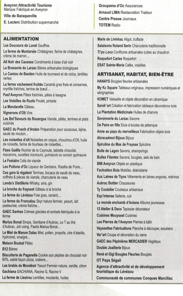 Baraqueville sera une invitation à flâner, explorer, s’émerveiller, valable tout le week-end. Autour de chaque stand se racontera une histoire. Quelle soit, de famille, de passion, de savoir-faire ou d’audace, elle sera belle et authentique. Elle s’écrit au quotidien avec ces hommes et ces femmes qui façonnent, inventent et réinventent notre Aveyron. Baraqueville en sera, fièrement, un chapitre à part entière, une page colorée et savoureuse dans le grand livre du savoir-faire et de la créativité du département. L’inauguration officielle aura lieu vendredi soir à 17h30. Rendez-vous, dans la Gazette, tout au long du week-end pour en parler… Ci-dessous liste le programme