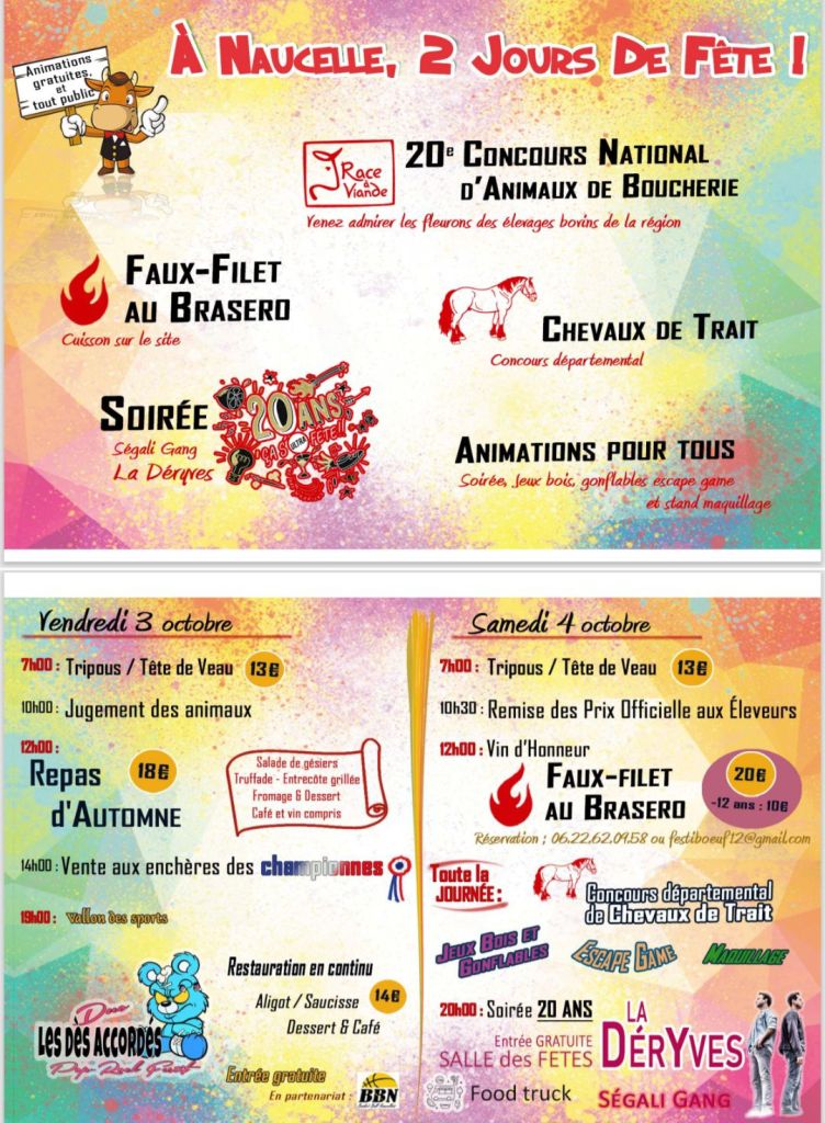 On n’a pas tous les jours 20 ans, et cette année, c’est Festibœuf qui les fête ! Vendredi 3 et samedi 4 octobre, Naucelle sera en fête pour célébrer la 20e édition de son célèbre Concours National d’Animaux de Boucherie. L’évènement se déroulera sur le site du complexe sportif, derrière Intermarché.
