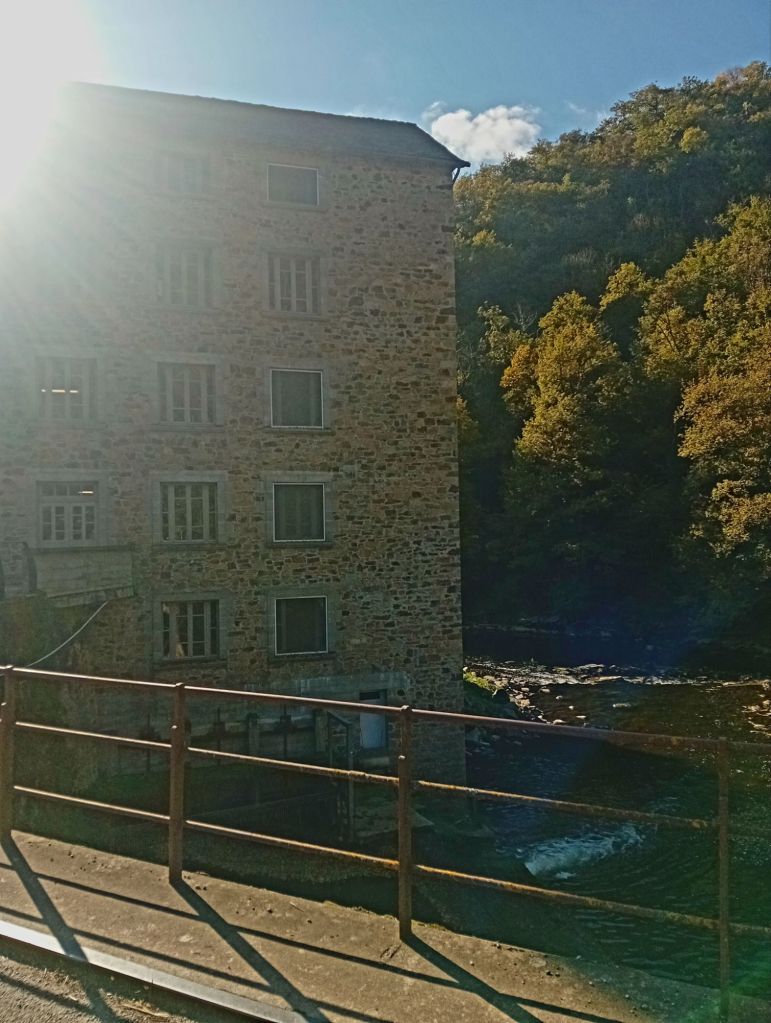 La route descend, serpente, s’enfonce doucement dans la forêt flamboyante. En contre-bas, au détour d’un virage, lové dans son écrin bucolique et verdoyant, le moulin apparaît. Dans la vallée encaissée, il se dresse fièrement, auréolé des rayons de soleil automnal. A ses pieds, la rivière Aveyron, fredonne ses joyeux clapotis, telle une mélodie du bonheur, simple, vraie, défiant les affres du temps.