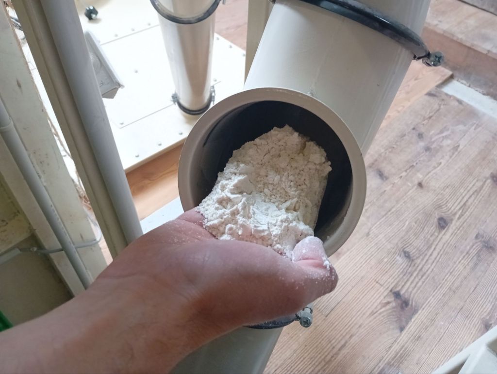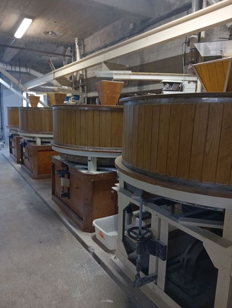 Chaque meule pèse une tonne pour un diamètre d’un mètre cinquante. Leur entretien – rhabillage, retaillage- est un savoir- faire transmis de génération en génération. « Ça ne s’apprend pas dans les écoles » m’explique Loïck. « La mouture à la pierre de silex est beaucoup plus lente, mais elle produit une farine riche en minéraux et vitamines. Ce qui donne au pain un goût authentique, une mie sauvage, plus humide, de couleur crème et une texture qui se distingue tant par la qualité que le visuel. » précise Loïck.
