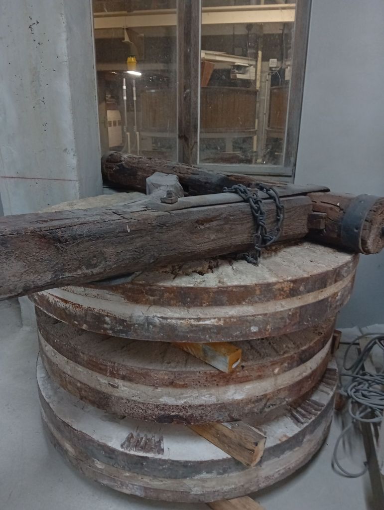 Pourtant en 1992 Joël et Christian prennent une décision à contre-courant : ils réinstallent une pierre de mouture en silex. Alors que ces meules avaient disparu depuis les années 50, supplantées par les cylindres plus rapides et plus productifs, adaptés à une production industrielle, alors, en plein essor. D’une qualité exceptionnelle taillées et assemblées à la main, ces pierres meuleuses, dures, poreuses et résistantes étaient fabriquées à la Ferté-sous- Jouarre jusqu’en 1953 . « Aujourd’hui , les meules sont en granit » déplore Loïck. Mais, lui et son père continuent, patiemment, d’amasser leur collection de meules de silex. Glanées dans de vieux moulins, des granges… Elles sont exposées dans le moulin, tel des trésors de musée. Deux trônent, majestueusement, à l’entrée.