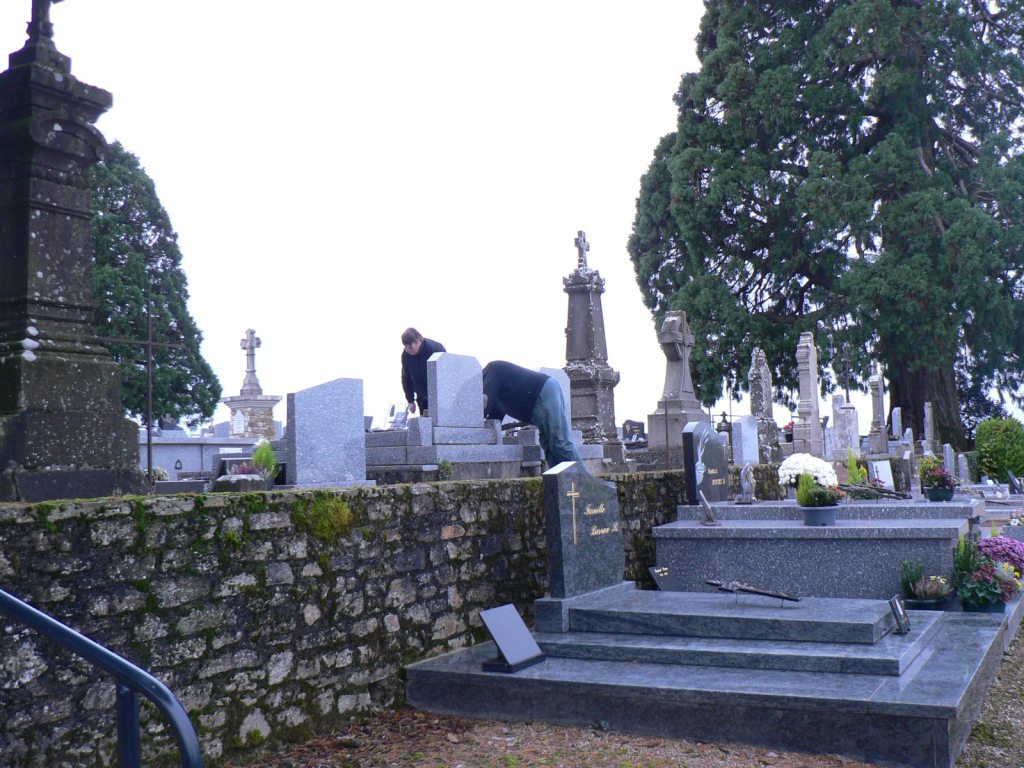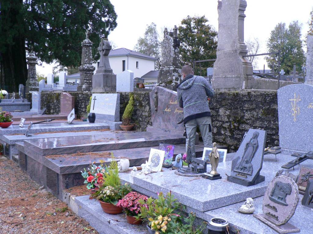 Autour d’eux, les familles, courbées sur les tombes, nettoient, frottent, font briller le granit. Les gestes sont lents, attentifs. On replace une photo. On redresse une plaque. On dépose avec délicatesse, les pots de fleurs. Le cimetière s’anime, tendrement traversé par une effervescence tranquille- celle de la Toussaint qui approche.