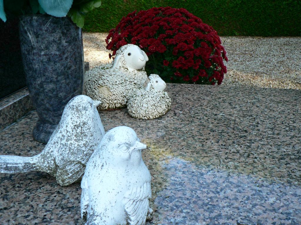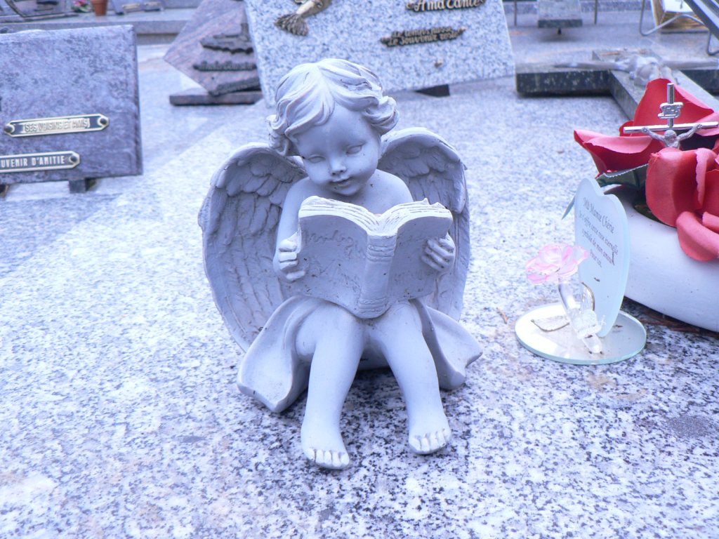 Parmi les fleurs et les croix, sur des tombes veillent des colombes de porcelaine, des petits moutons, des nains de jardin, des anges. Ces douces présences évoquent, souvent, l’innocence de vies trop brèves. Elles sont les tendres gardiennes de leurs mémoires éternelles.