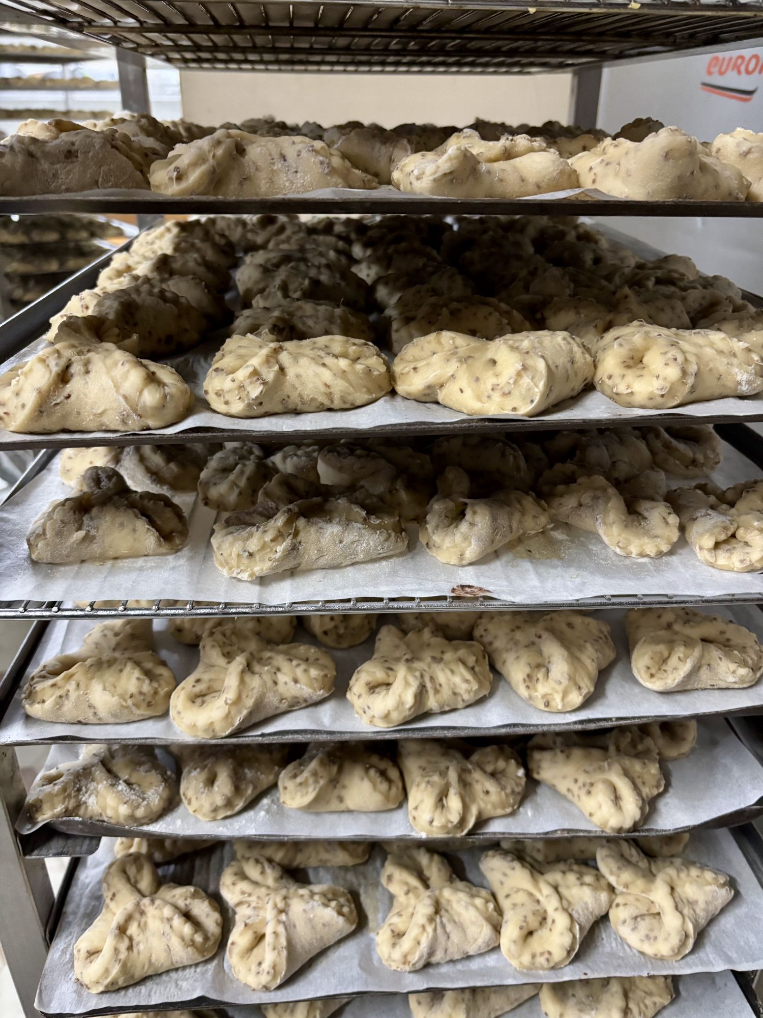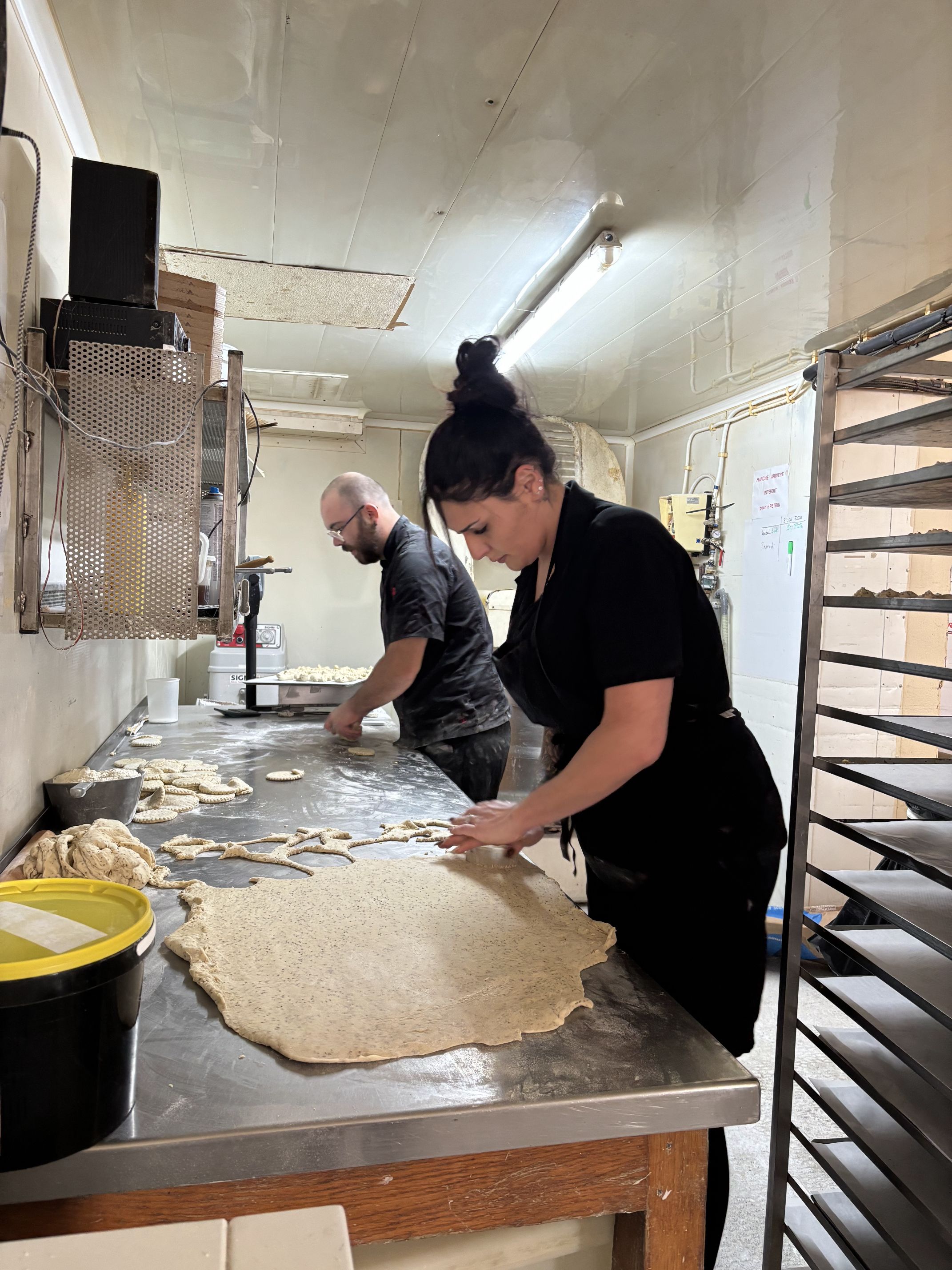 Depuis début octobre, Sarah et Rafaël préparent avec soin les produits destinés au salon. Alors que le village dort encore, bien avant que le chant du coq ne résonne, les pétrins s’activent doucement. Le fournil se réchauffe, l’air se parfume d’effluves de levain et farines mêlés qui accompagnent leurs gestes. Chaque jour le levain est rafraichi et se marie dans une danse gourmande aux farines bio locales et label rouge des Moulins Marty et Calvé. Du façonnage à la cuisson, chaque mouvement guidé par la rigueur et la maitrise, fait naitre des goûts authentiques , respectueux de l’histoire de la boulangerie. Comme une chorégraphie silencieuse, gracieuse où s’harmonisent héritage et dévotion. Ces journées s’étirent, longues et riches, longues comme un jour sans pain…