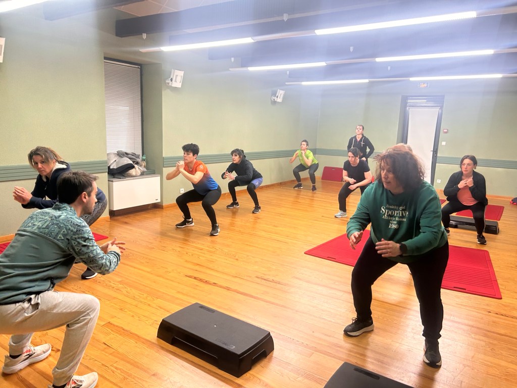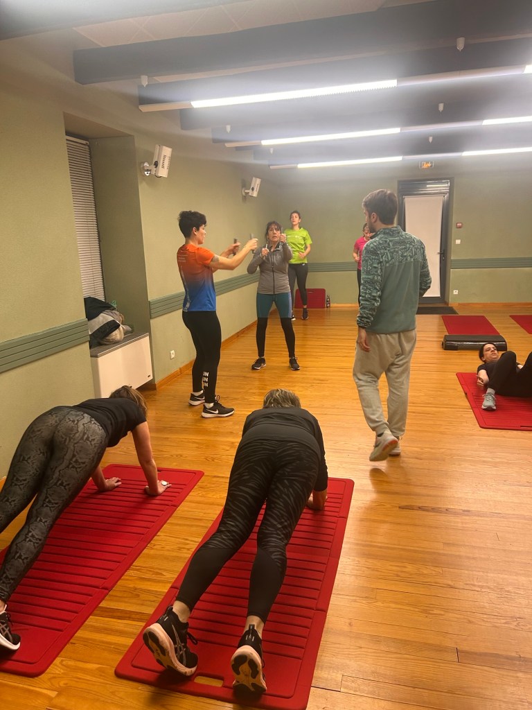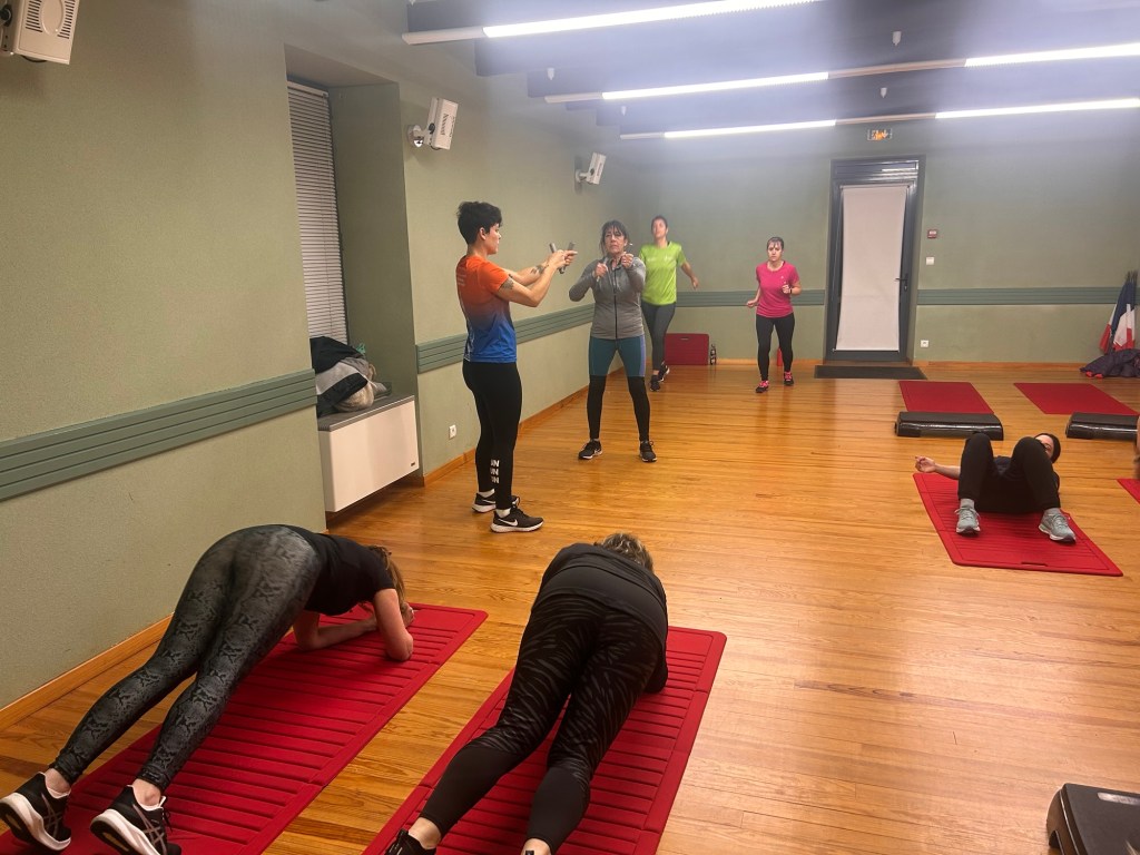Le second groupe arrive, plus dynamique. Ici, le renforcement musculaire est plus poussé, le cardio plus présent. Les ateliers s’enchaînent, sans temps morts : pompes, déplacements, enchaînements variés, marches au sol que l’on monte l’on descend d’un côté de l’autre. On passe d’un atelier à l’autre, accélère, on transpire, on se dépasse un peu plus. Les mouvements se succèdent avec intensité, le rythme ne faillit jamais. puis petit à petit la cadence ralentit, les gestes s’allègent et chacune retrouve son souffle . C’est la fin des cours