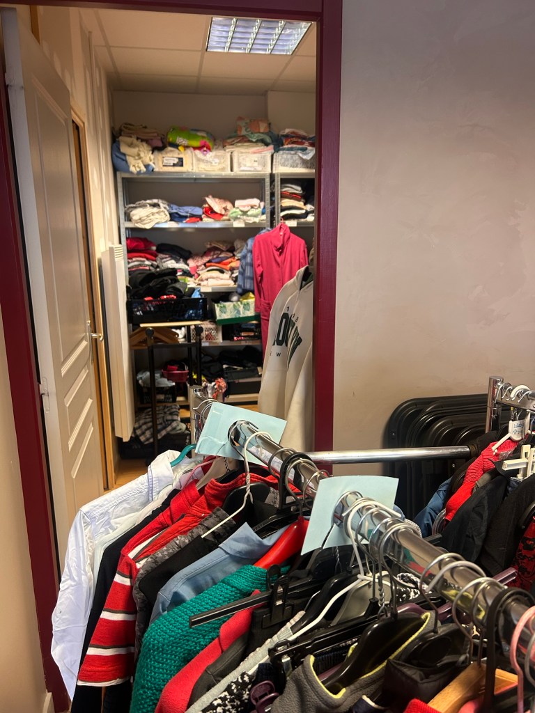 Je retourne, donc, à la boutique, où trois sympathiques bénévoles me proposent gentiment de faire le tour du propriétaire. Me voilà embarquée dans ce qui ressemble bientôt à un véritable safari textile. Les espaces sont clairement organisés : ici le coin homme, là, le coin femme, les vêtements enfants, bébé. Le portant des ados est un peu moins garni. Un appel aux dons pour compléter ce rayon est donc lancé ! Les vêtements sont soigneusement triés par taille, ce qui facilite grandement la recherche. Ici, tout relève de la seconde main : chaque pièce a déjà vécu une première histoire et s’apprête à en commencer une nouvelle. Fouiller, découvrir, tomber sur une pièce inattendue fait tout le plaisir de cette aventure fripière.