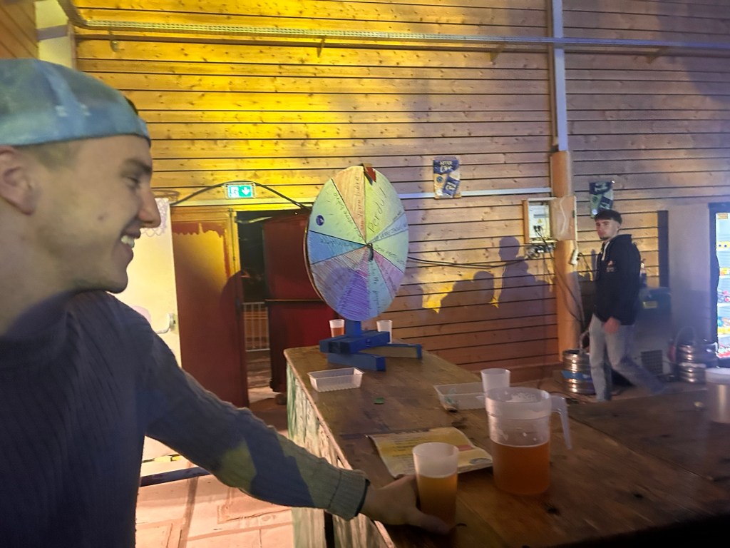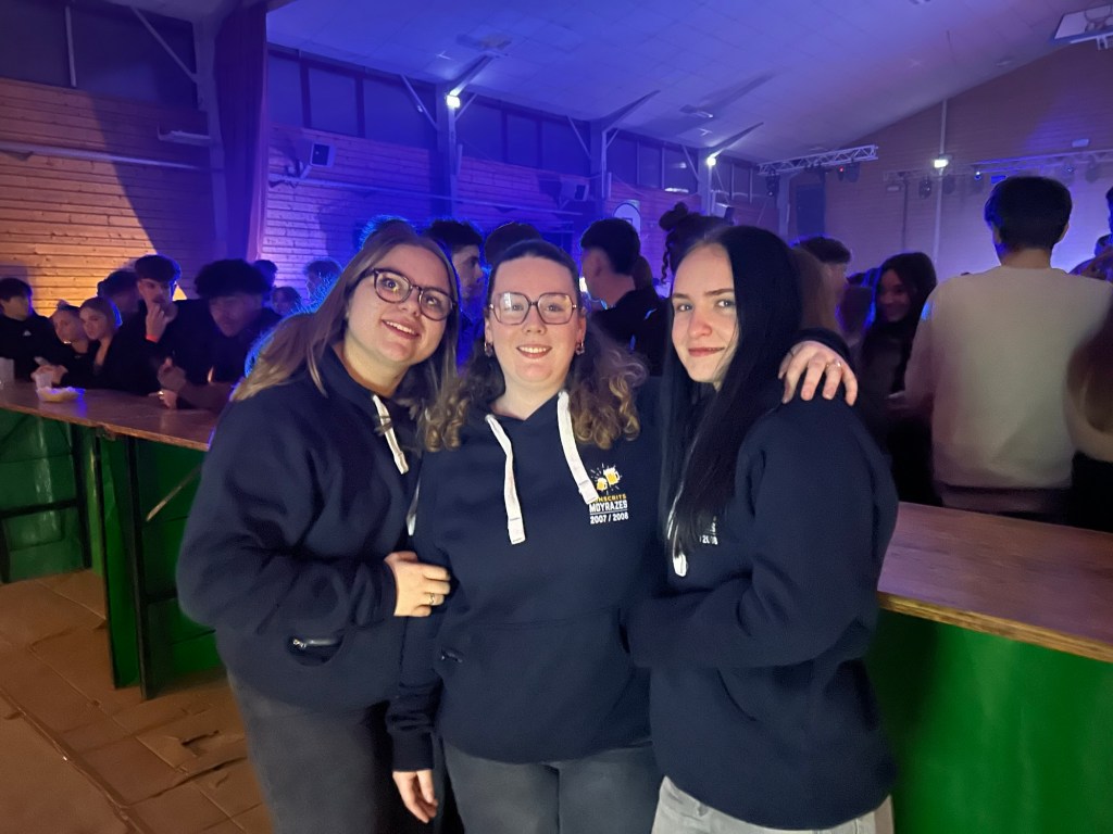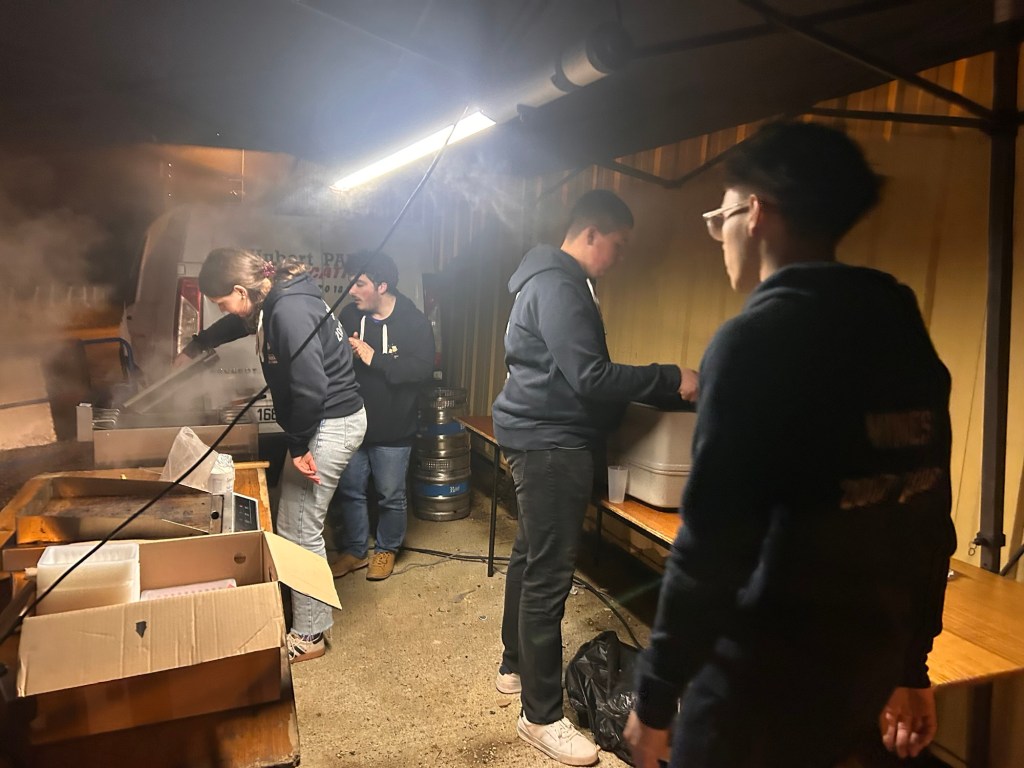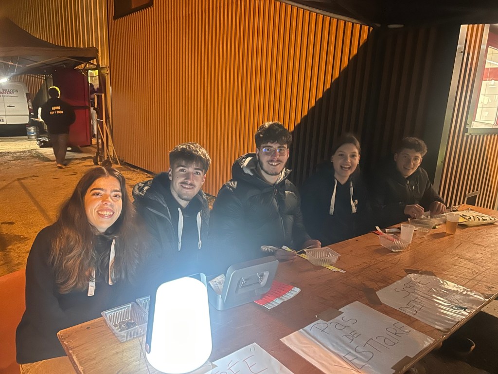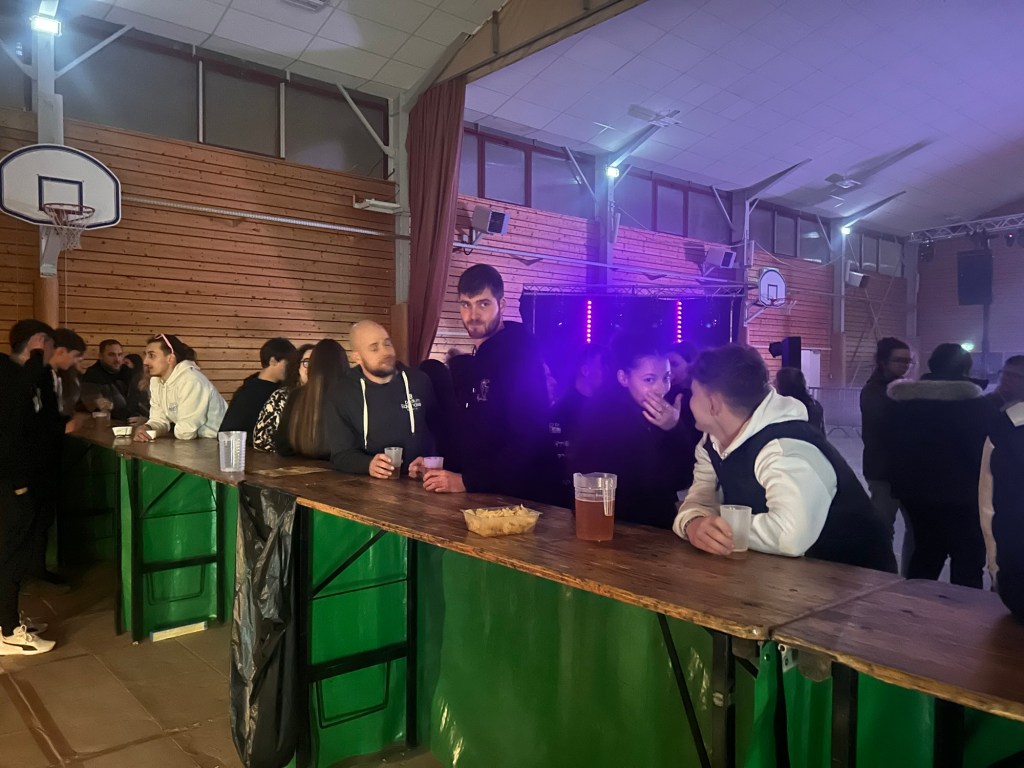 Attirée les volutes de fumée gourmandes venant de l’extérieur, je découvrais Lucas, Lisa et Sylvain, tous conscrits, affairés à faire cuire saucisses et frites avec sérieux, méthode et une bonne dose d’ entrain ! Dans cet antre de la gourmandise, le quatuor distillait des effluves gastronomiques et alléchants, indispensables en de telles soirées, pour éponger le trop- plein d’élixirs de houblon ingurgités et la faim des aficionados de la piste de danse bien sûr !