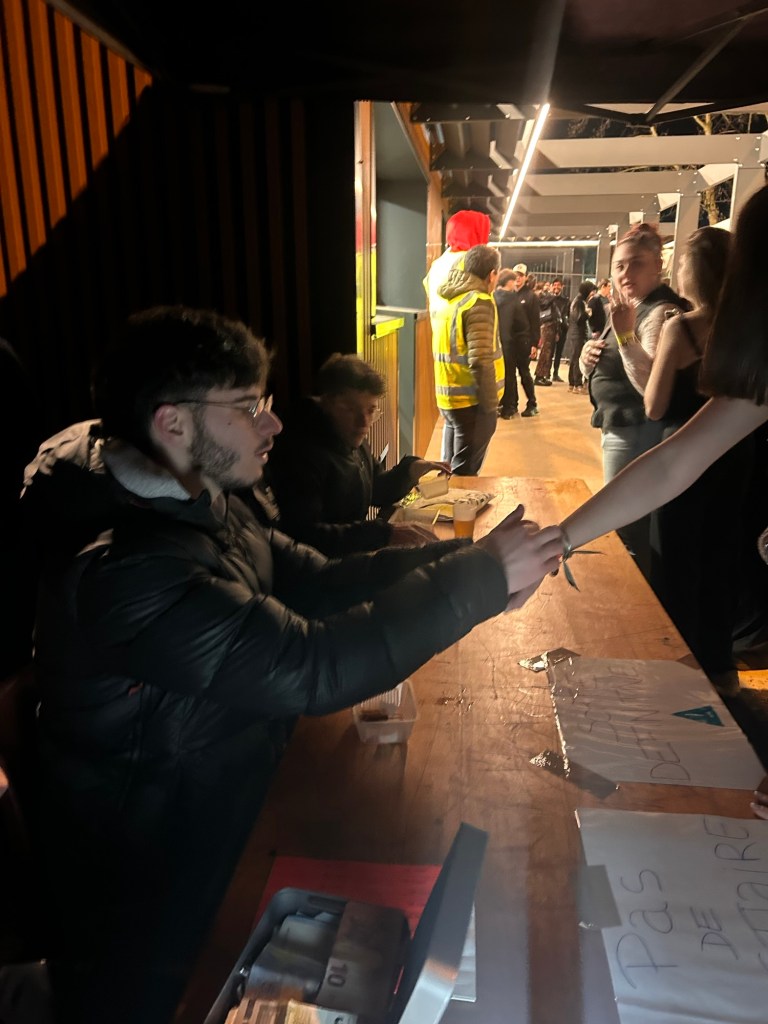 Après avoir franchi ce sympathique cordon de vigiles démystifiés, avec lesquels j’ai établi une complicité toujours utile en de telles circonstances – j’arrivais devant la table des entrées. Là, une brochette de conscrits s’activait joyeusement à distribuer bracelets et tickets. Parmi eux, Joseph, le secrétaire de l’association accusé je le rappelle dans un précédent article de ne pas faire grand chose . Usant du droit de réponse que je lui avait octroyé le jeune homme en pleine action me sollicitait. « Regardez, là je travaille! ». J’en profitais pour immortaliser la scène, opposant, au poids des mots, le choc des photos, n’en déplaise à ses camarades médisants !