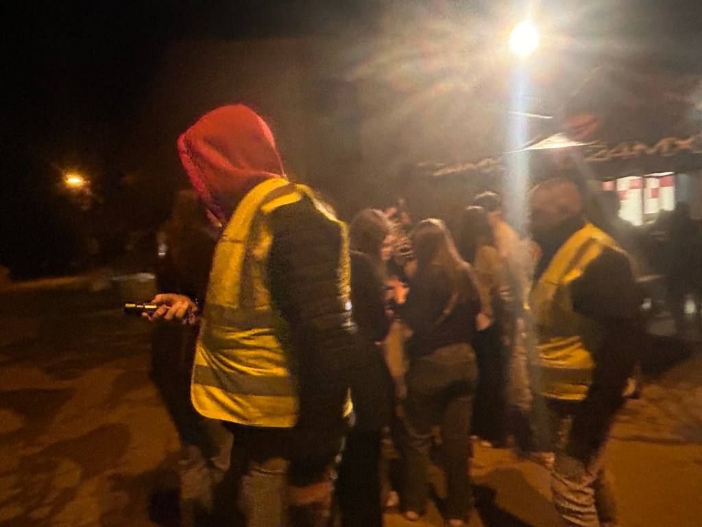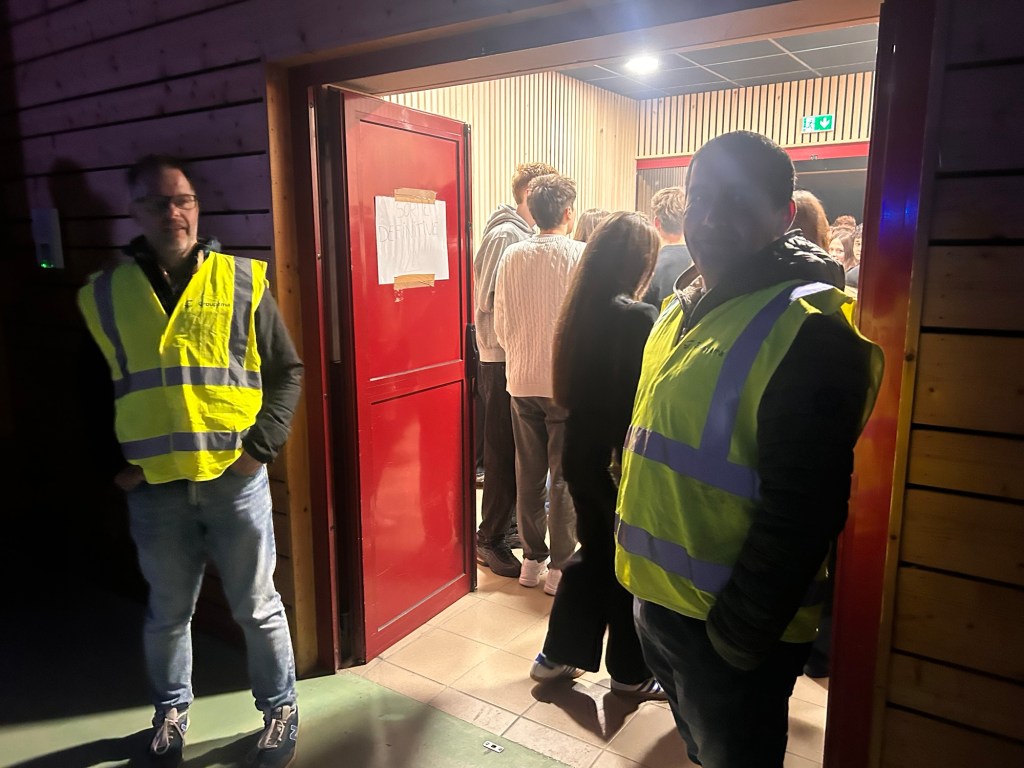 En arrivant aux abords du parking de la salle des fêtes, j’aperçois, au loin, des gilets fluo. J’imagine déjà la musculature saillante et les regards sévères de ces vigiles auprès desquels je vais devoir négocier mon entrée. Puis au fur et à mesure que je m’approche, mes craintes s’estompent : Il me semble même reconnaitre des têtes familières… Bah oui, forcément, ce ne sont que des parents, souriants et pleins de bonne humeur, qui jouent les gros bras pour l’occasion.