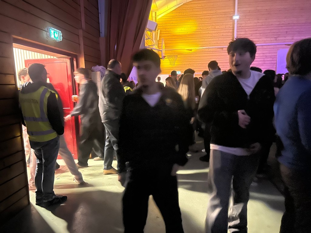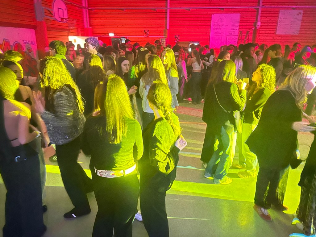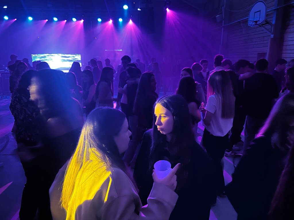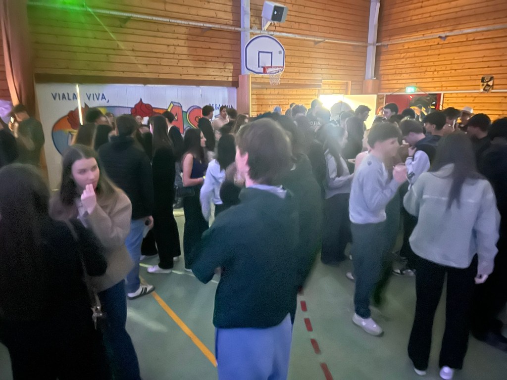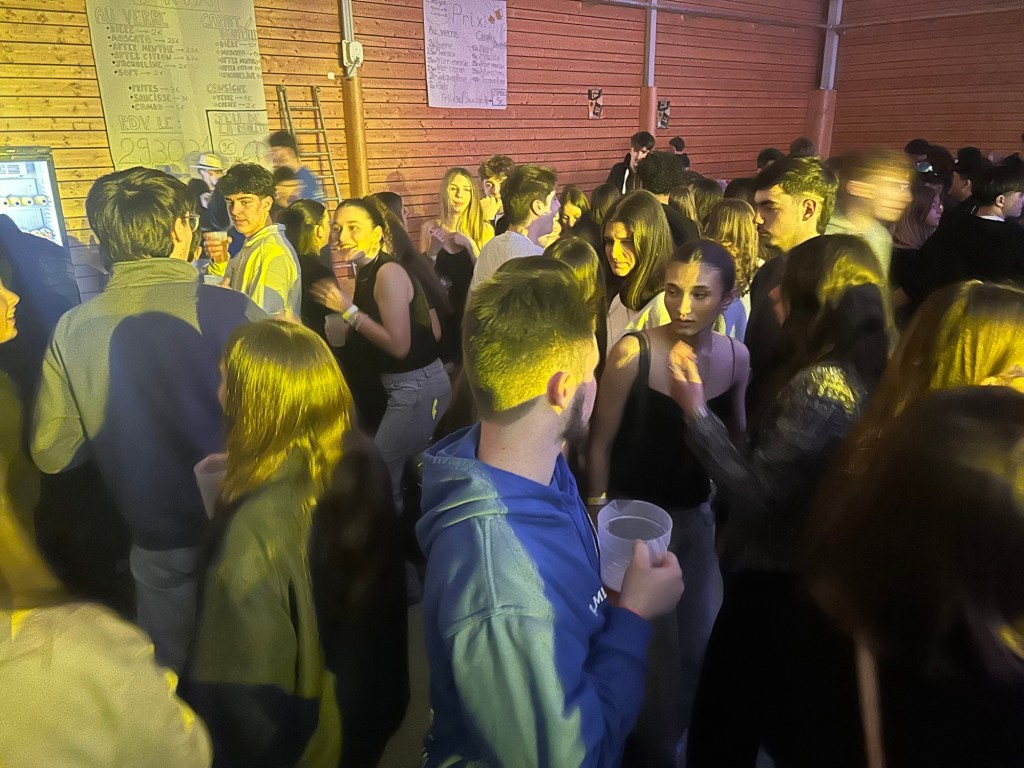 De retour dans la salle, je slalomais dans la foule, de plus en plus dense. Les groupes de jeunes arrivaient par vagues. L’ambiance montait crescendo…Ça brillait de partout : paillettes, sacs scintillants, talons pour les filles et coiffures impeccables pour les garçons, chacun semblant avoir revêtu son costume de bal pour flamboyer sous les lumières.