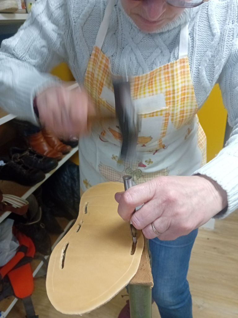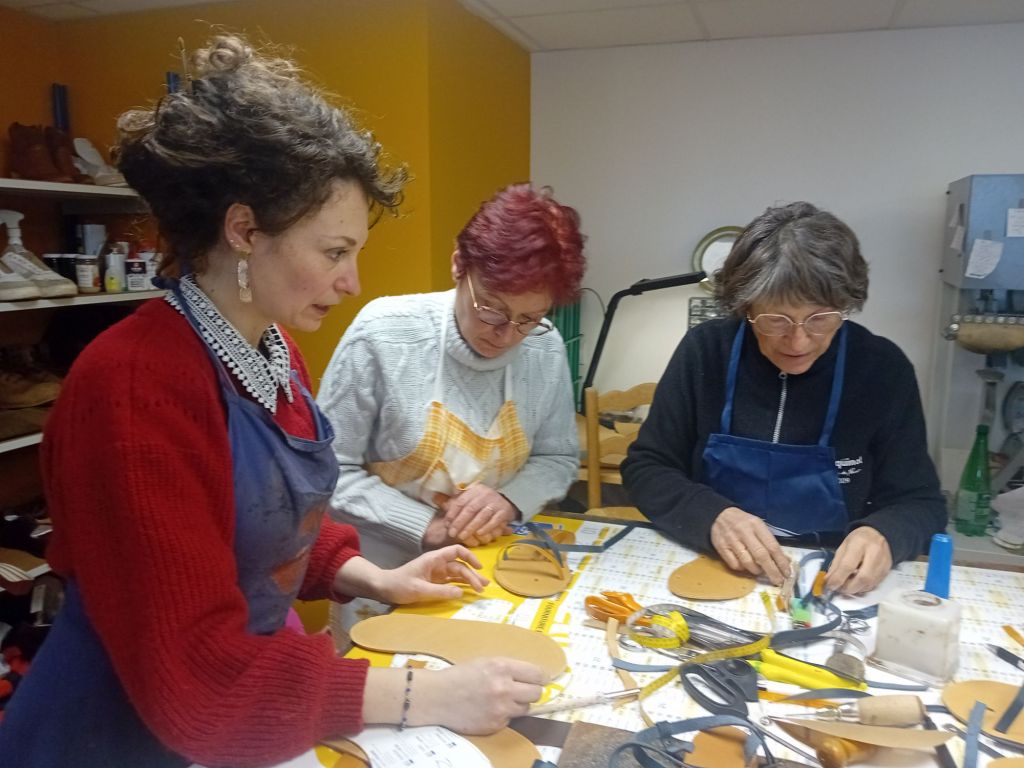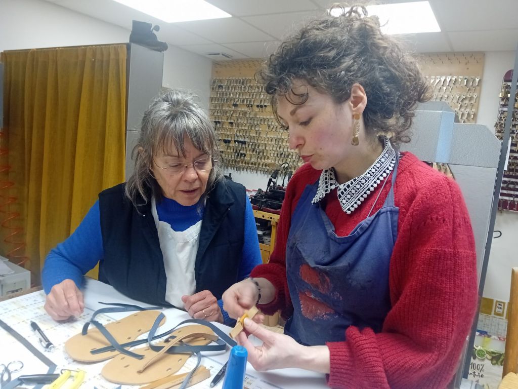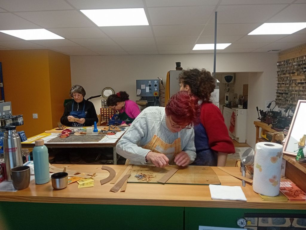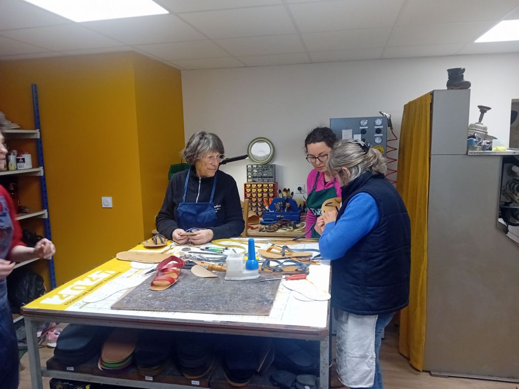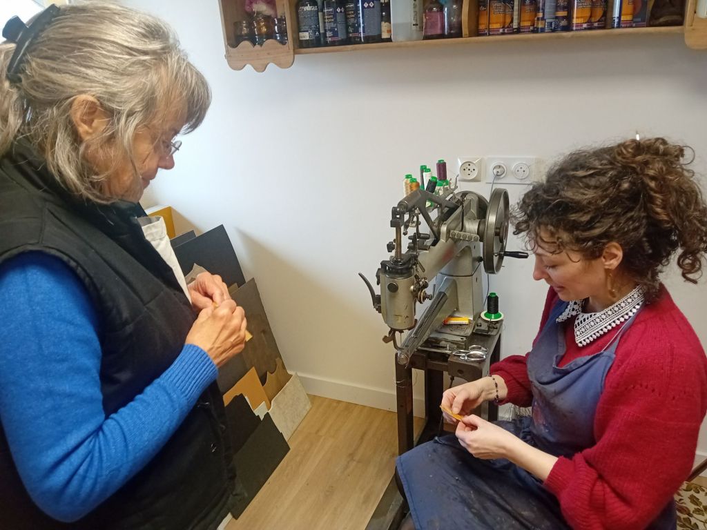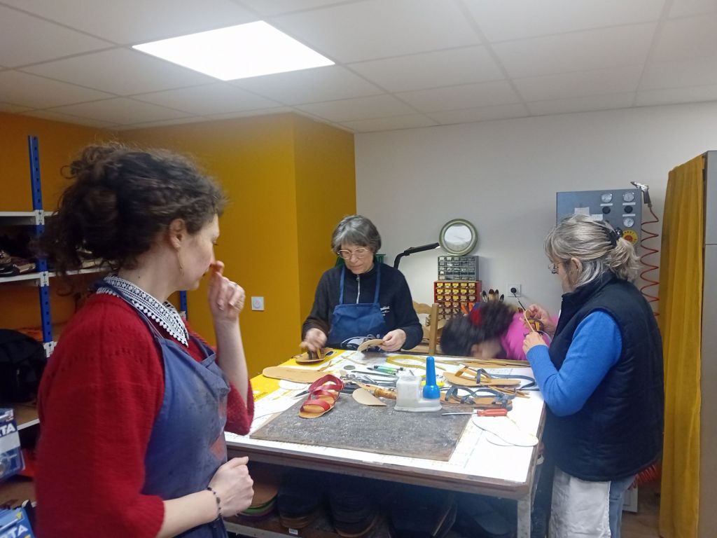 Bien qu’une évidente bonne humeur animait le groupe, la concentration restait de mise. « Comment s’appelle ce côté du cuir ? » demandait Vanessa à Christine. « Le, le … côté fleur? » répondait-elle hésitante. « Eh non, là,c’est le côté chair ! ». « Donc on assemble, maintenant, poursuivait Vanessa, mais on fait attention pied droit et pied gauche ». Chacune avait bien compris : ici, pas question de mettre les pieds dans le même sabot ! Bidouillant avec la colle ou le poinçon elle pouvaient compter sur les mains expertes et parfois salvatrices de Vanessa sur leurs réalisations. Au fil des heures, elles progressaient, pas à pas, portée par les conseils et les astuces de Vanessa. Et chacune de trouver ainsi sa technique, Une belle énergie régnait dans l’atelier, chacune s’encourageant mutuellement au fur et à mesure de l’avancée de la réalisation…