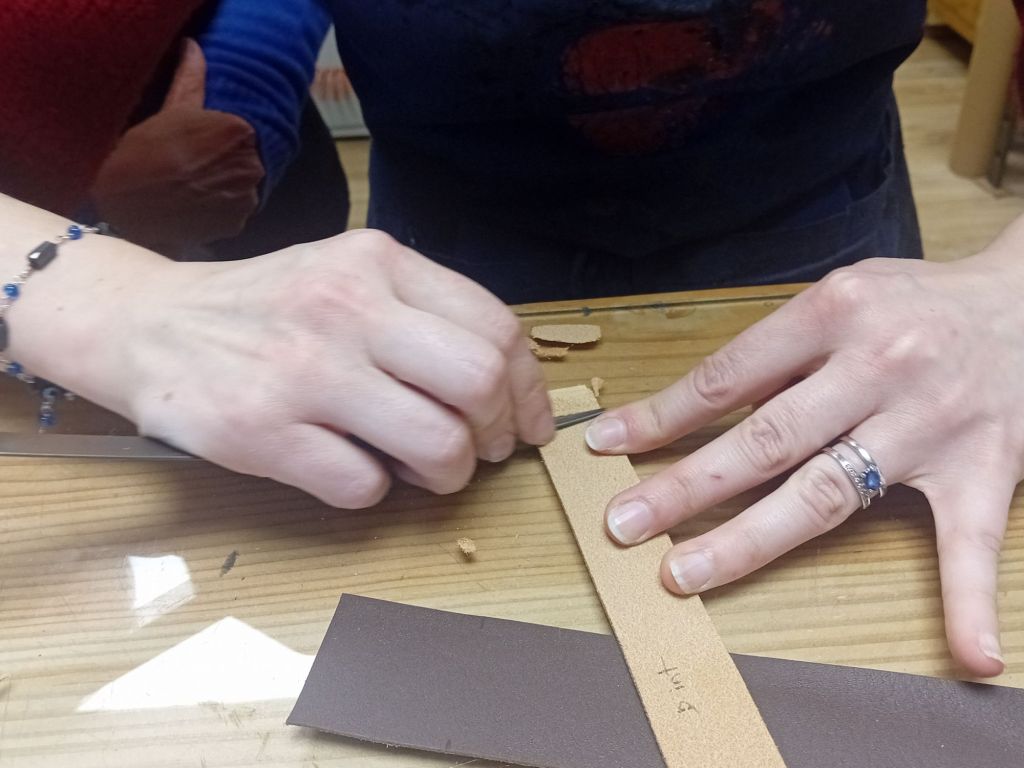 Elles prenaient pleinement conscience de l’ampleur du travail et de la minutie nécessaire. « Un travail de patience et puis il faut aimer le cuir. C’est une matière difficile et c’est physique. Il faut le couper à la main… ». Nadine ajoutait, riant : « J’ai mal à l’avant-bras ! » Le choix du modèle avec des brides larges s’avérait un défi supplémentaire : « Faire des brides, c’est physique, et en plus je fais des larges, si j’avais su ! » regrettait-elle en tapant lourdement du marteau, le cuir rebelle. » Tu veux que je le fasse? » proposait Vanessa en fine pédagogue. Le « oui ! » de Nadine sonnait, incontestablement, libérateur !