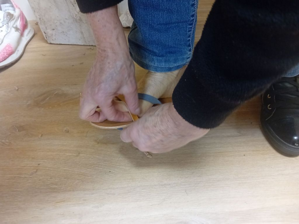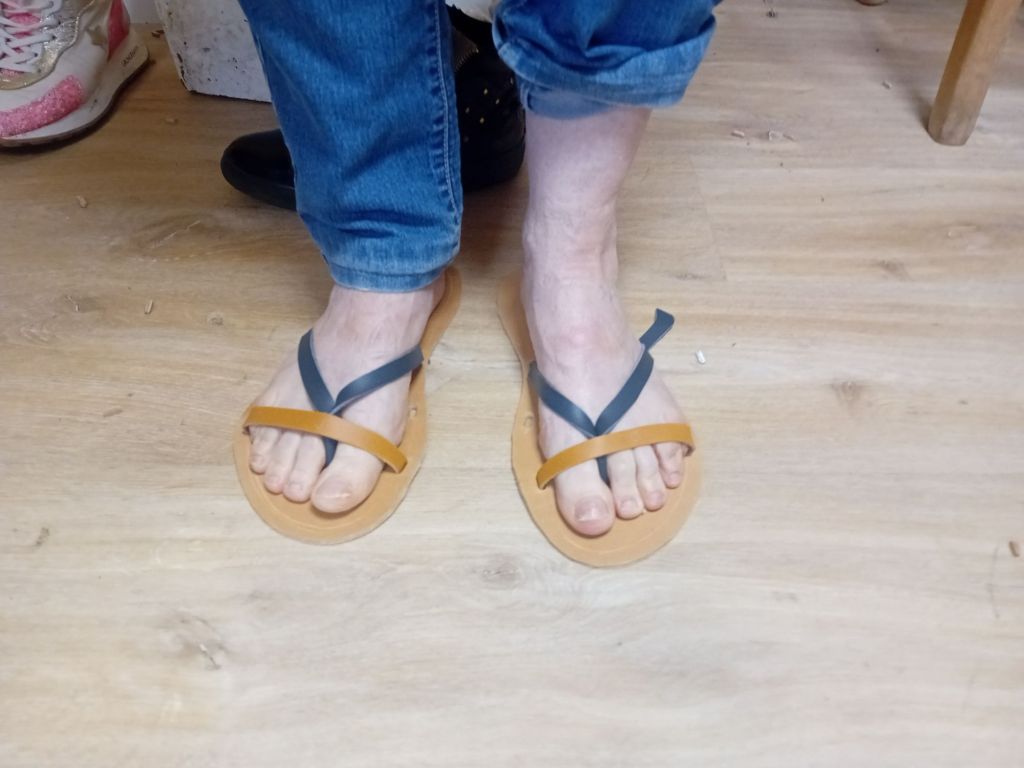 Ces quatre dames étaient très enthousiastes à l’idée de faire des pieds, et surtout des mains, pour confectionner, elles -même, leurs sandales sur-mesure. Une activité presque familiale, ce jour-là, puisque la mère de Vanessa, Anne Marie, sa belle mère Nadine, Flore également de sa parenté, participaient avec Christine à cette journée initiatique et créative. Vanessa proposait quatre modèles à la réalisation. Deux d’entre- eux emportaient les suffrages des apprenties.