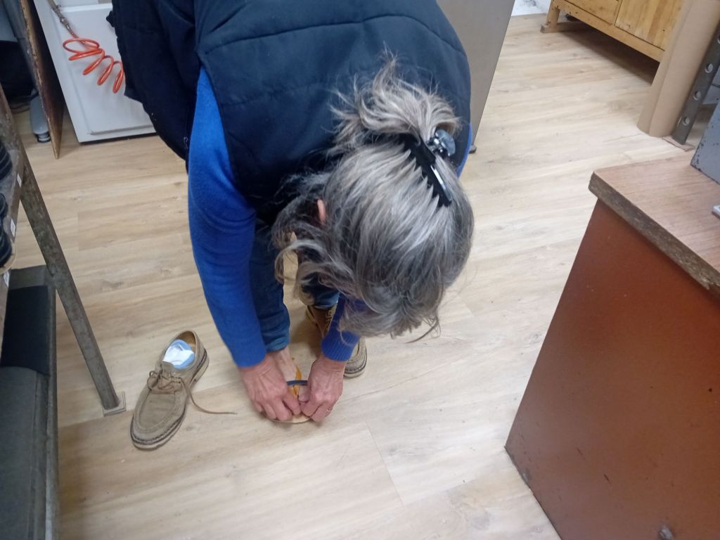 Pour mettre les pieds dans le vif du sujet, il ne s’agissait pas d’avoir deux mains gauches, car comme me l’expliquaient les apprenties du jour : « Nous avons commencé par prendre nos mesure de pied l’une pour l’autre. Une sacrée responsabilité, il faut être précis c’est du sur-mesure ! » La première étape pratique consistait à découper, dans un vieux calendrier en carton, le patron des semelles, tandis que les outils aux noms alambiqués jouaient déjà de leur malice….