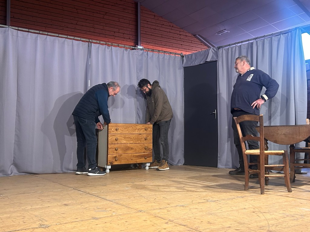 Les rires fusent parfois quand un geste dérape ou qu’une réplique tombe à l’eau, mais l’ensemble garde un rythme presque chorégraphié. Les portes s’ouvrent se ferment, les dialogues s’enchaînent. L’ensemble garde un rythme presque chorégraphié. Quelques petits détails restent encore à régler. Enfin, détails qui ont leur importance : la bouteille que les déménageurs doivent « siffler » pendant une de leurs scènes doit-elle être pleine ou vide ? Ne serait -il pas judicieux que remplir le carton qui contient de la vaisselle cassée avec des brisures de verre pour un effet scénique parfait. Idem pour les intermèdes musicaux et dansants entre les trois pièces de théâtre tout doit être réglé comme du papier à musique !