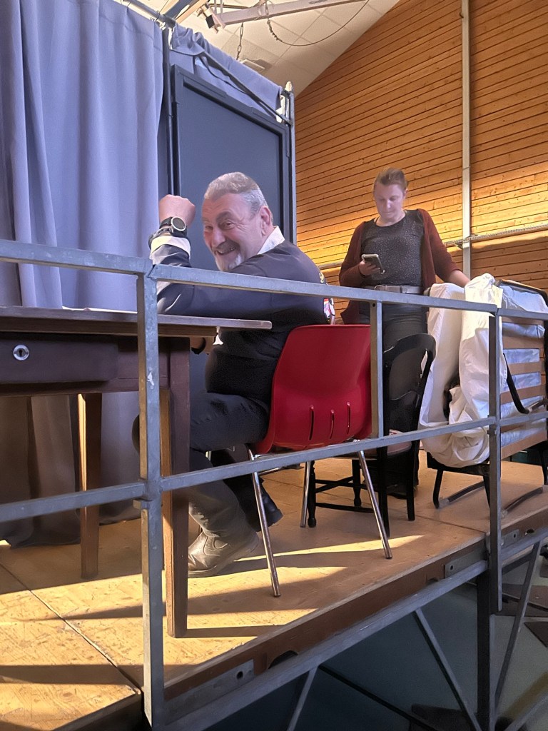 Bernard, futur régisseur, se tient pour l’instant côté public. Il observe. La régie n’étant pas encore installée. Alors il assiste aux répétitions pour s’imprégner « du groupe que je connais encore peu » avoue-t-il. Il s’est retrouvé en moins de temps qu’il ne faut pour le dire embarqué dans cette aventure théâtrale, un peu comme on monte dans un train en pensant accompagner quelqu’un…et qu’on se retrouve finalement à faire tout le voyage. La force de persuasion de sa sympathique voisine Carole, comédienne de la troupe n’y est pas pour rien ! Le voilà donc embarqué dans cette dynamique collective. Il sera acteur de l’ombre au cœur de la régie maître du son et des lumières.
