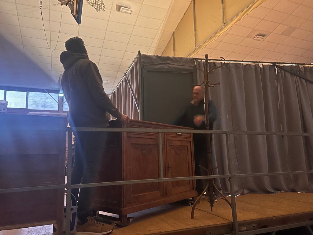Ici, tous les comédiens sont polyvalents. Ils endossent le rôle de décorateur, d’accessoiriste, de machinisme, de costumier… avec un même même enthousiasme. Ainsi ils déplacent, bricolent, ajustent chaque détail du plateau. Ils ont monté les cloisons, accroché les rideaux, fixé les portiques, rassemblé les costumes…