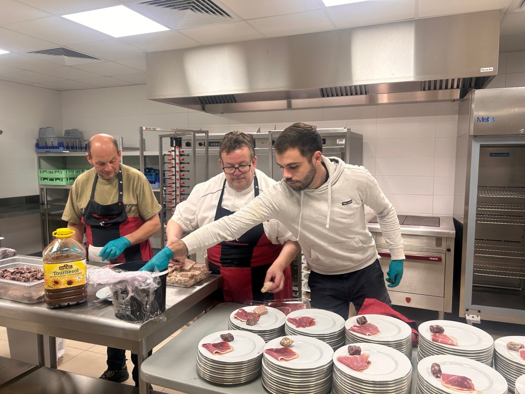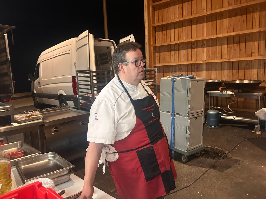 Côté cuisine, « les Coquelicots » restaurateurs, traiteurs de Moyrazès étaient à l’œuvre, avec Laurent Bastide et son équipe, une dizaine d’extras était aux, ou autour des fourneaux. Au menu : du bœuf bien sûr, et des gourmandises salées et sucrées aveyronnaises. À l’extérieur, les effluves de truffade qui s’échappaient des poêles et les généreux sucs de viande embaumaient le quartier. A l’intérieur, serveurs et petites mains s’activaient. Qui pour préparer, qui pour servir les assiettes, qui pour déboucher le Marcillac…. »C’est très agréable de travailler dans de telles conditions » soulignait le cuisinier.