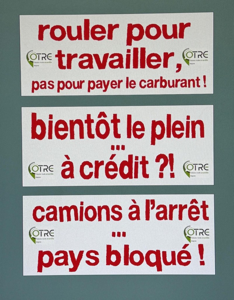 À Rodez, les transporteurs aveyronnais, adhérents du syndicat OTRE 12, s’activent en vue de la mobilisation prévue demain mardi 31 mars. Les banderoles sont prêtes à être brandies, les slogans à être scandés. « Rouler pour travailler, pas pour payer le carburant », « Bientôt le plein à crédit »… Voilà leurs mots, pour dire la colère et l’inquiétude d’une profession sous pression.