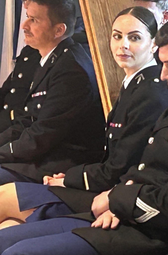 Audrey n’a pas de képi, mais un chignon tiré à quatre épingles et un tailleur-jupe impeccable qu’elle arbore avec prestance.