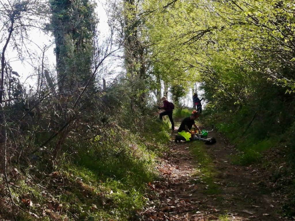 Dans les chemins, le travail ne manquait pas. Les ronces s’accrochaient, les branches basses barraient le passage, comme d’ultimes signes de résistance à cette armada en marche. Il fallait tailler, dégager, tirer, parfois contourner. Ici, une tronçonneuse ouvrait le passage, là un sécateur s’attaquait aux repousses les plus tenaces. Au fil des coupes et des tailles, les bénévoles voyaient leur motivation grandir à chaque coup de serpette victorieux. Encouragés par cette dynamique , ils voyaient le terrain se libérer peu à peu. Au détour d’un talus, une couleuvre, surprise par toute cette agitation, s’éclipsait subrepticement entre les herbes hautes. Une apparition qui n’a pas non plus manqué de dérouter quelques “ouvriers du jour”. Ainsi , peu à peu les chemins se redessinaient…