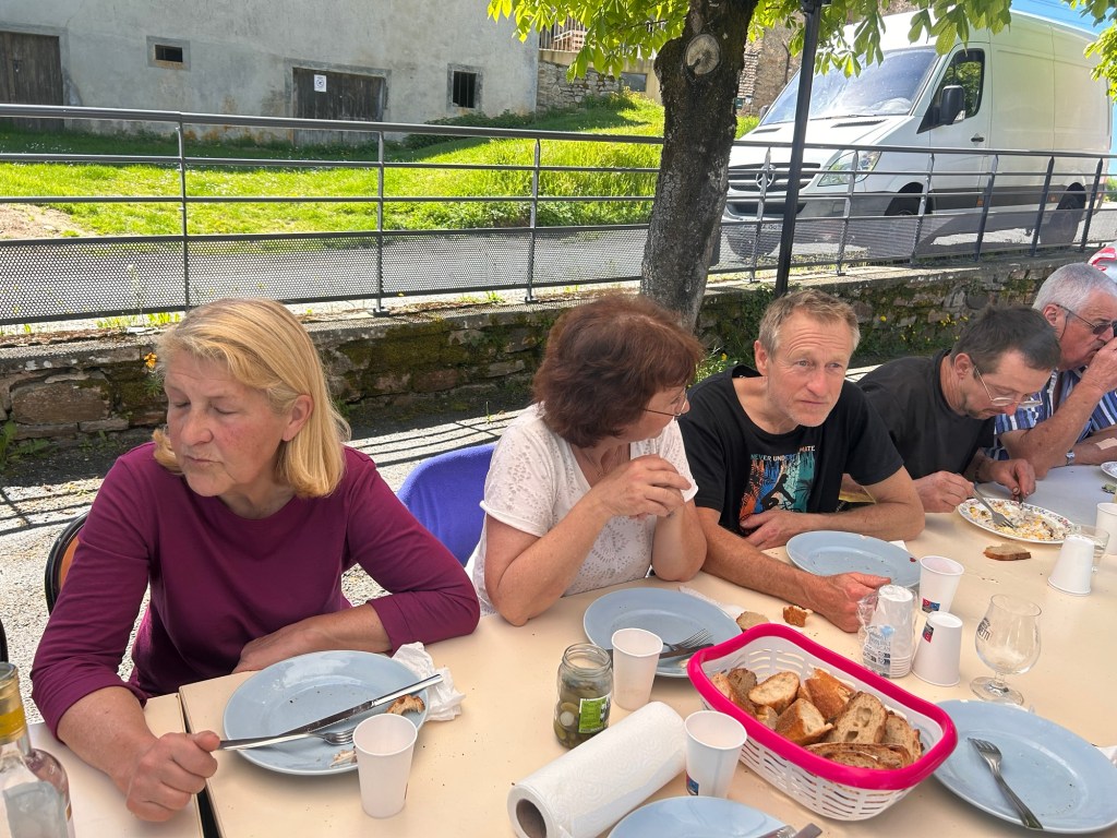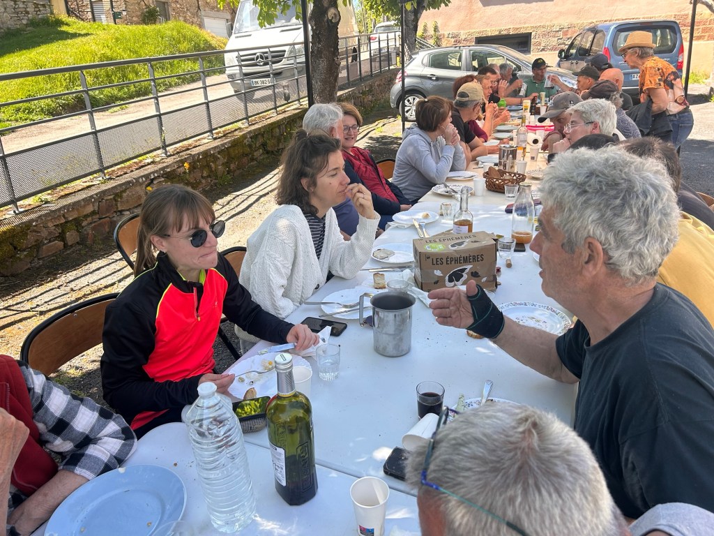 L’apéritif ouvrait la partition gourmande et chacun gagnait progressivement les tables… Rapidement les discussions partaient dans tous les sens, et c’est bien cela qui faisait le sel du moment. On parlait du village, d’une maison, d’un souvenir, d’un chemin justement… On se découvrait des histoires communes, des passions partagées, des affinités insoupçonnées…Rires et sourires fusaient. Et ce moment s’inscrivait comme une parenthèse un peu hors du temps où l’on mesure combien les échanges simples et naturels sont précieux.