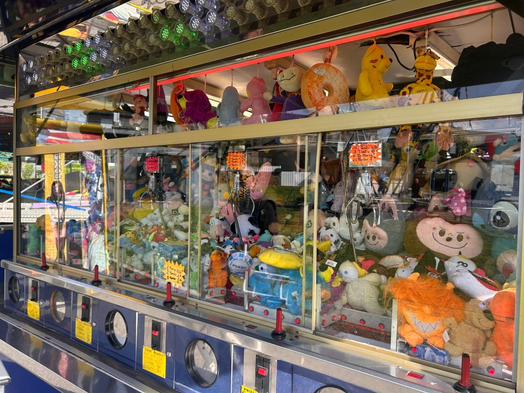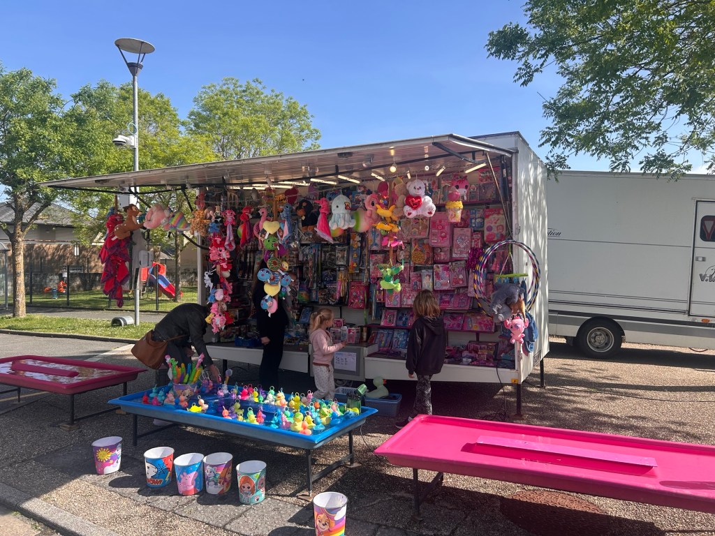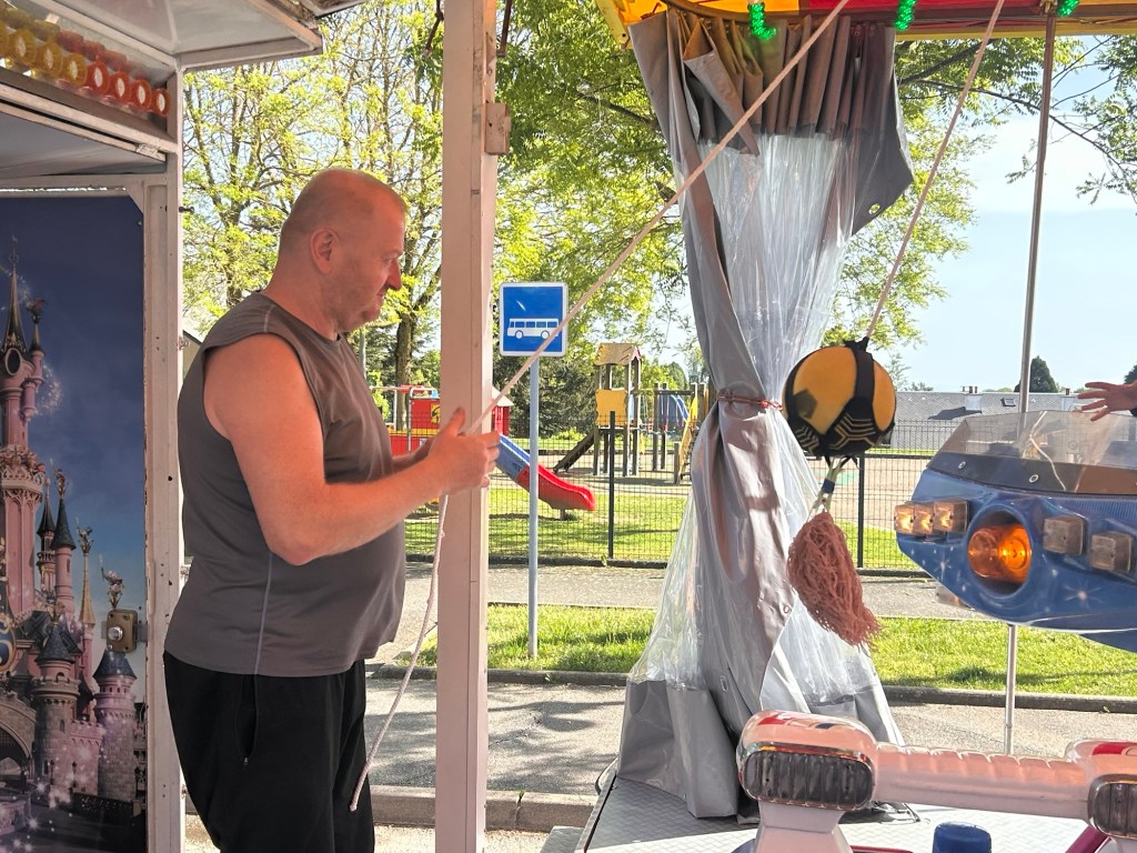Raymond, installé derrière son stand de pinces à peluches. Assis d’un côté ou de l’autre, suivant la course du soleil, cherche l’ombre. Il observe avec calme et bienveillance. Pour lui, la fête est une habitude, presque une seconde nature. Fidèle au rendez-vous, comme tous ici. Il vient pour la cinquième année.