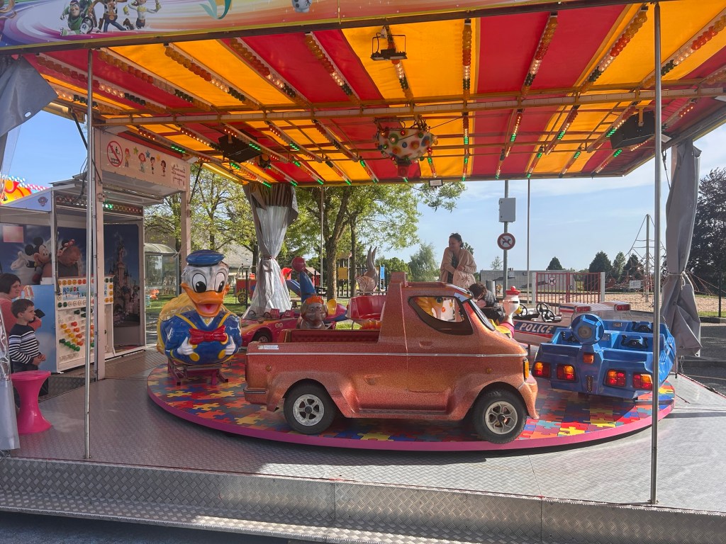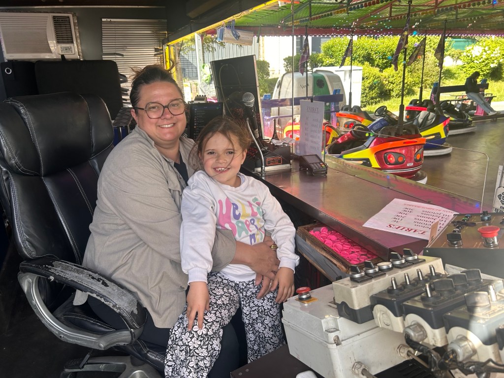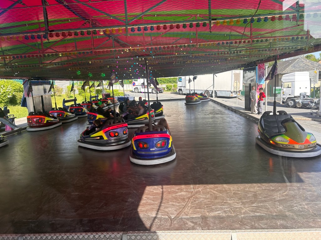 Florence, elle, est l’exception qui confirme la règle, ses parents sont agriculteurs pas forains. Originaire du Lot, elle rencontre Raymond lors d’une fête de village. C’était il y a 20 ans, heureux parents de deux enfants depuis , il sont installés en Tarn-et-Garonne, où ils ont aussi une activité de location de structures gonflables. Elyne avec sa maman, tout sourire depuis son poste de contrôle, a ce petit privilège des tours de manège gratuits. « Voir les gens s’ amuser, les enfants heureux, rencontrer plein de monde » voilà ce qui motive Florence. C’est ce qui donne du sens à ses longues journées. Même leurs tarifs s’adaptent à cette philosophie. Le tour d’auto-tamponneuse est à 3 euros. Un choix assumé : rester accessible; permettre au plus grand nombre de profiter. « Quitte à en faire un peu plus pour que la fête soit partagée » assure Florence.